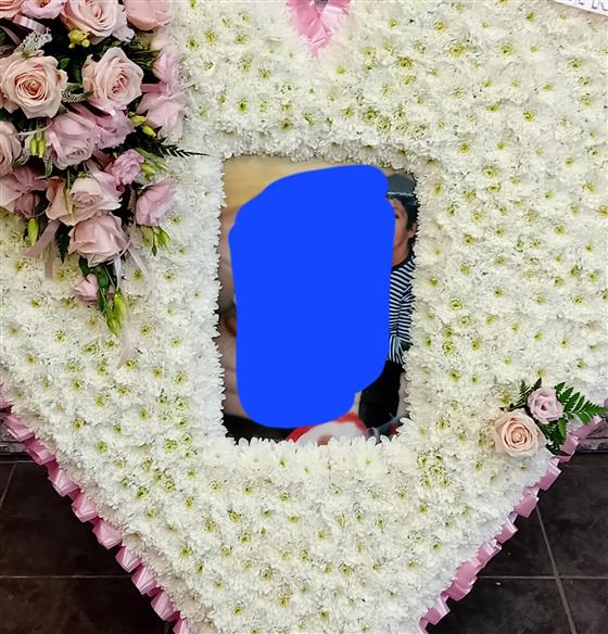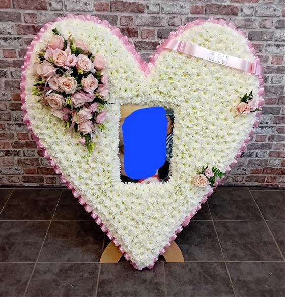 Large bespoke Heart made on a wood stand approx. 4ft high with up to A3 Photo based in double white Chrysanthemum and finished with pale pink flower spray.