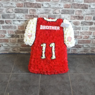 Expertly crafted with double spray Chrysanthemums to create this red and white Arsenal football shirt design when someone's passion was football