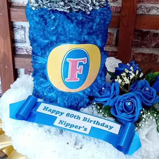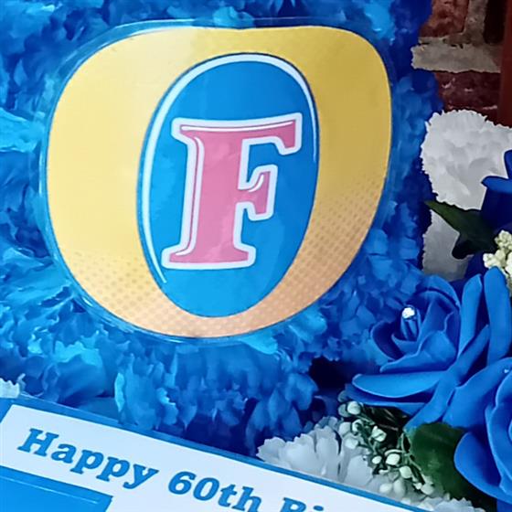 Beautiful handmade artificial grave/memorial “Can of Fosters ” Tribute with carnation base and a rose spray .