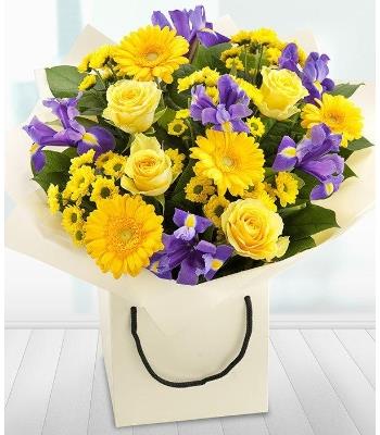 Bright, bold and beautiful. The gorgeous purple Irises in this gift bag bouquet simply zing against the bright yellow Roses, Germini and Spray Chrysanthemums.