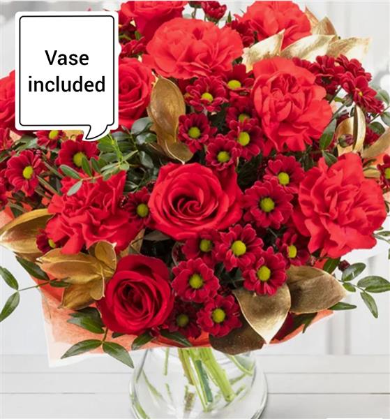 Send the perfect gift this Christmas with our Christmas Cracker bouquet, a festive arrangement featuring vibrant red roses, carnations, and complementary seasonal foliage