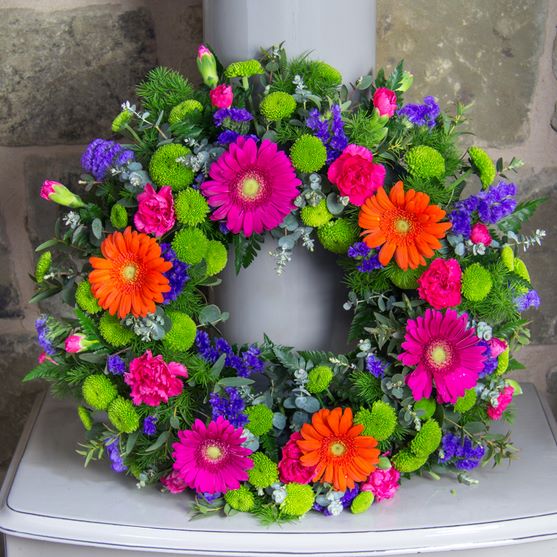 Loosely arranged into a stylish 'open' wreath, this contemporary arrangement combines the most attractive and striking flowers with the richest colours of bold and bright orange and glowing pink germini. These bright colours are complimented by the luscious tones of the lime green spray chrysanthemums and rustic foliage. This is the ideal choice of tribute for those looking to mark the passing of a happy and fulfilling life.
