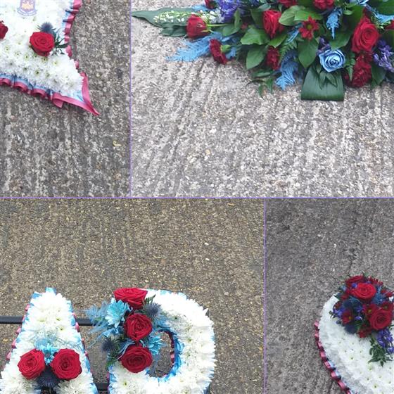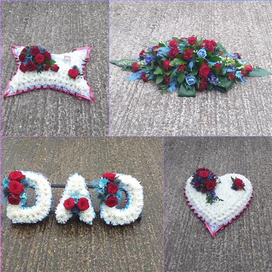 This Claret & Blue Collection has a 16inch Heart 18inch pillow 4ft Coffing Spray & Dad