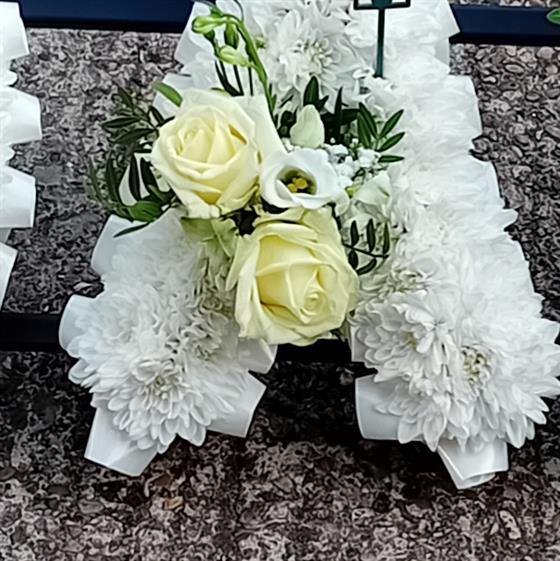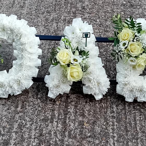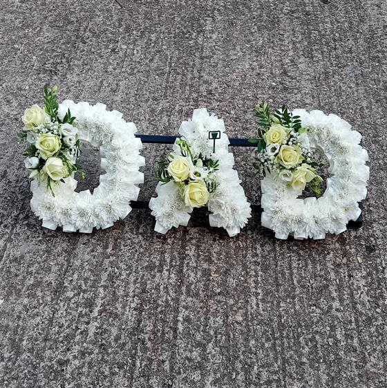 This DAD funeral flowers tribute is based in white Double Chrysanthemums. A perfect and fitting floral tribute for a much loved Dad.
