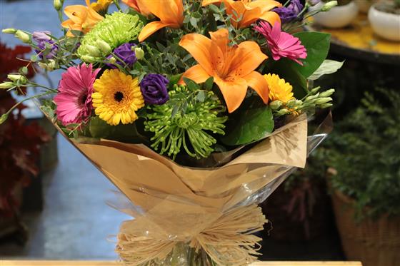 A striking bouquet of mixed blooms in bold shades including orange, cerise, lime, gold & purple.