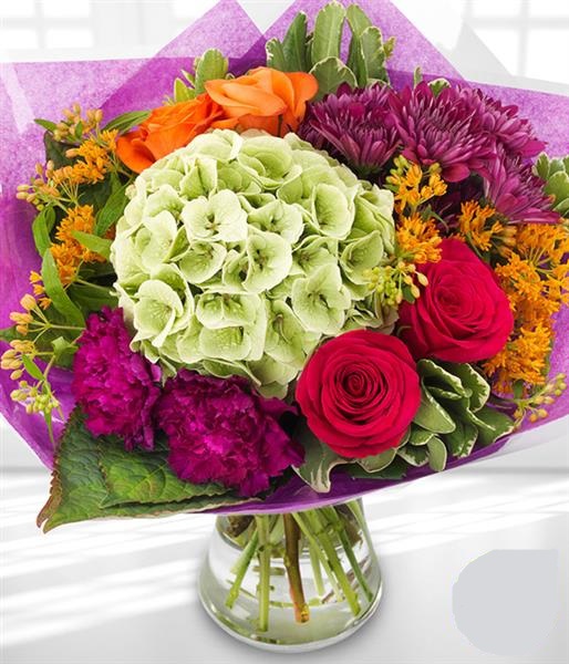 Green hydrangea is the focus in this contemporary arrangement, accompanied by cerise and orange roses, violet chrysanthemums and violet carnations, topped with pittosporum.