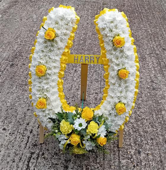 Large Yellow/White Horseshoe Funeral Tribute Wreath approx 28inch Tall mounted on a bespoke wood frame