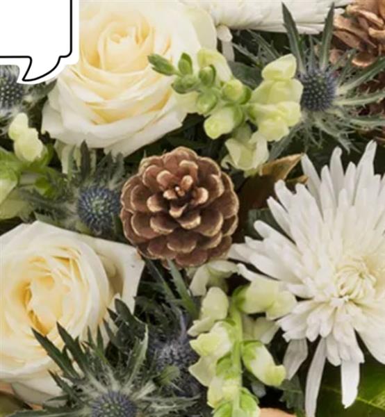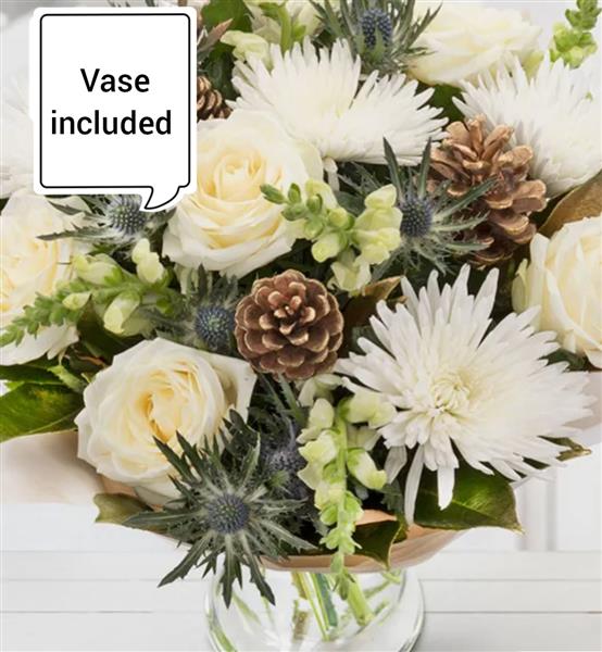 Ice white Roses, Carnations and Chrysanthemum are exquisitely combined with dried silver Poppies and Lotus seed heads. A stunning Christmas gift bag Bouquet