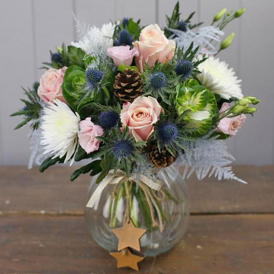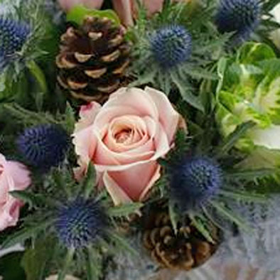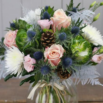A winter Bouquet with soft pinks, blues and whites including roses, eryngium and chrysanthemums.