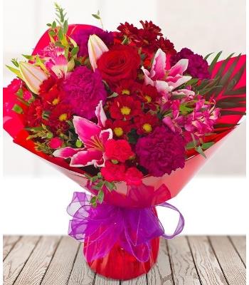 A romantic bouquet full of rich red and deep pink tones. This simply stunning hand-tied bouquet is presented beautifully to convey the right message to your loved one.