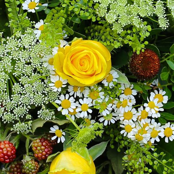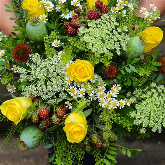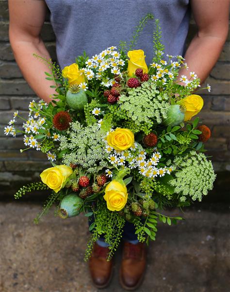 A hand tied based on yellow roses and wild country flowers to suit.