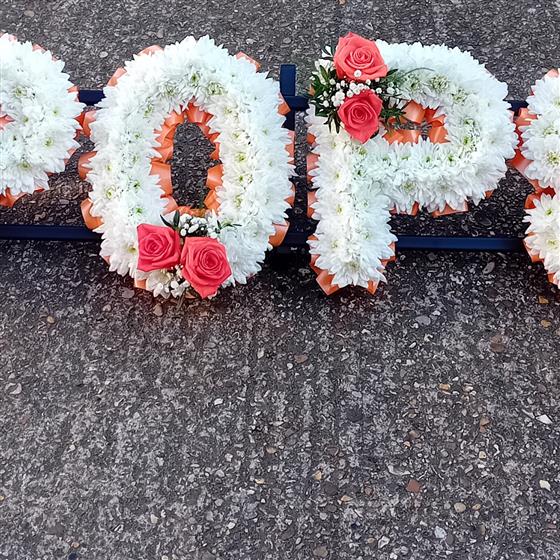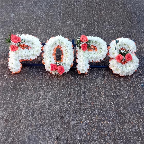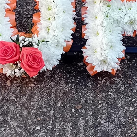 This Pops funeral flowers tribute is based in white Double Chrysanthemums. A perfect and fitting floral tribute for a much loved Pops.