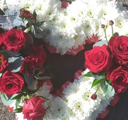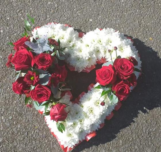 An open Heart-shaped funeral tribute Based in double White Chrysanthemums and a bold Red Rose arrangement.