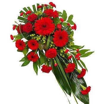 A stunning red single ended spray of Roses, Germini, Gerberas and Carnations all neatly nestled amongst an array of luscious green foliage