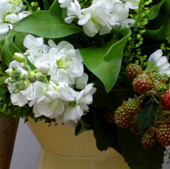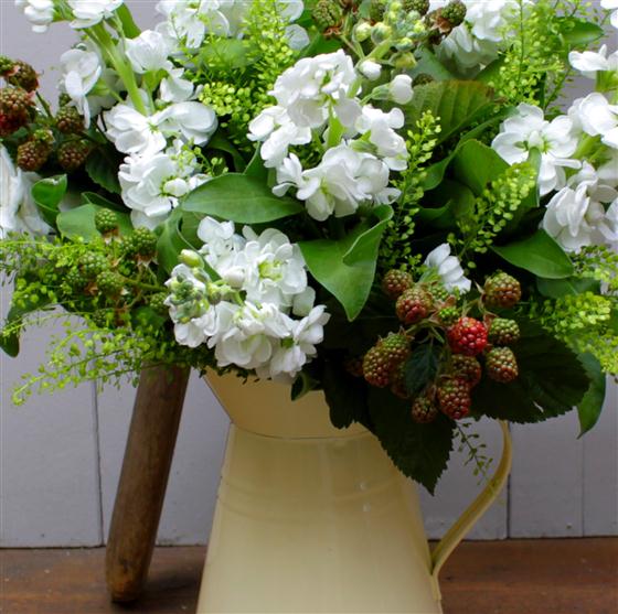 Beautifully scented stocks and seasonal foliage expertly arranged in an enamel jug.