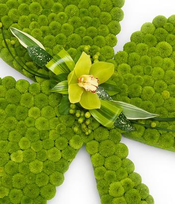 A shamrock shaped tribute. A luscious green Shamrock shaped tribute. A green Cymbidium Orchid sits on a base of green spray Chrysanthemums with variegated lime Dracaena and green Hypericum.