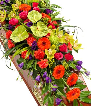 A colourful casket spray. Cerise Roses, green Cymbidium Orchids, Anthuriums, Chrysanthemums and Hypericum with orange Gerbera and Carnations are interspersed with purple Lisianthus beautifully presented on a bed of luscious green foliage.