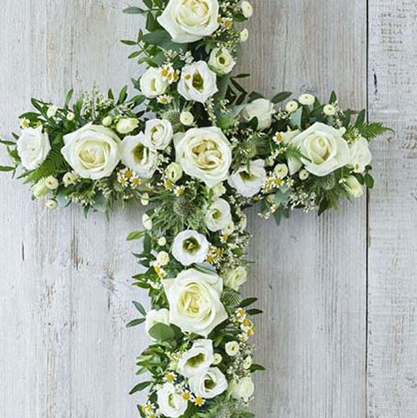 An elegant cross that contrasts an array of white blooms, including roses, chrysanthemums and limonium, with beautiful foliage.