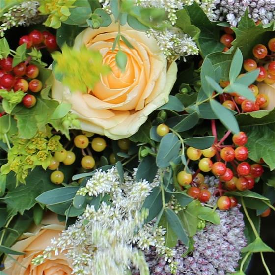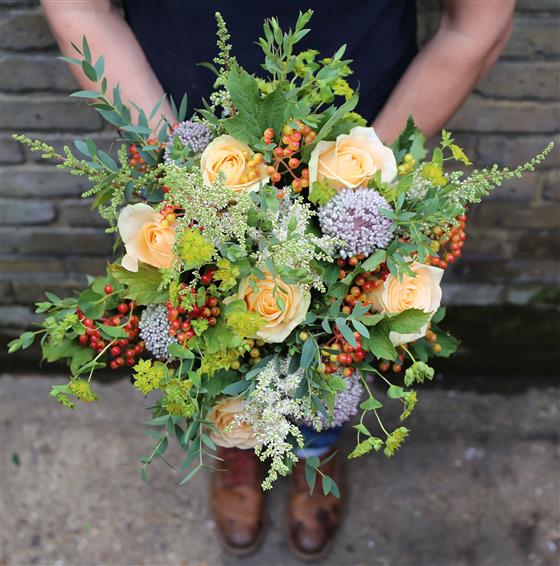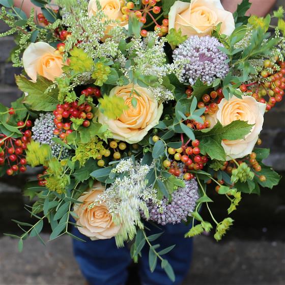 A hand tied based on peach roses and wild country flowers to suit.