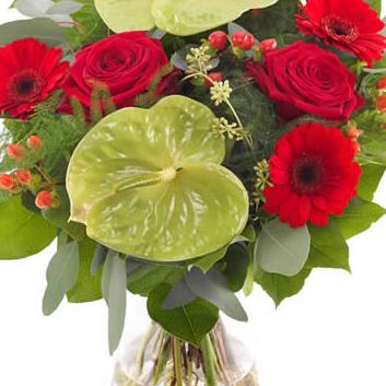 Aqua pack in red and green. Preferably with anthurium, germini, rose, hypericum, asparagus, eucalypthus and salal. (Or similar)