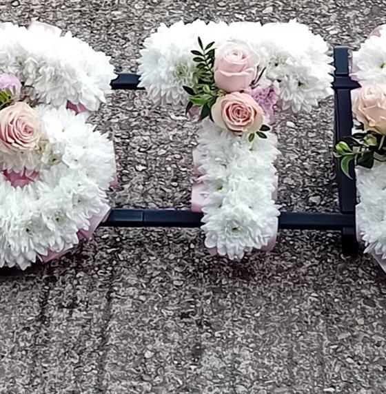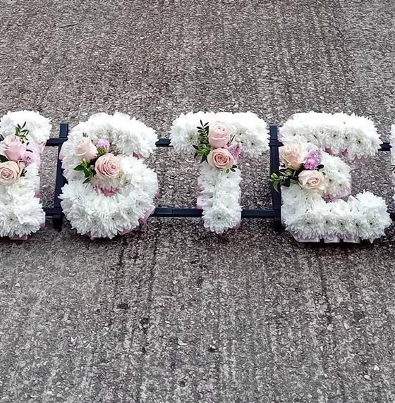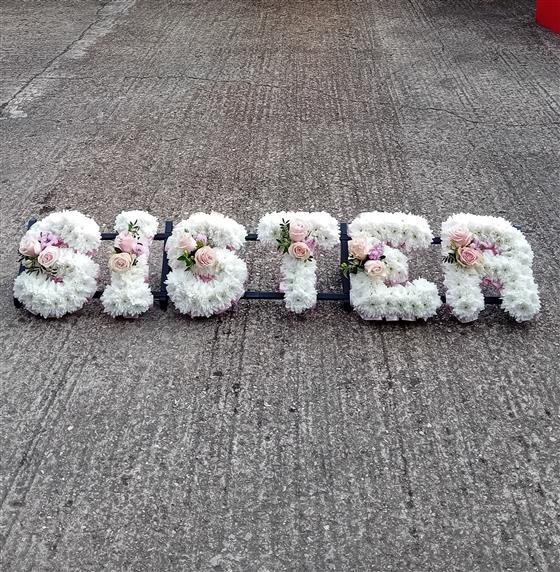 Sister Tribute created with double white chrysanthemum & finishes with a pale pink double Rose spray on each letter